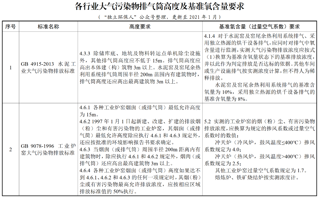一段時間以前,本站分享了關(guān)于廢氣各行業(yè)排氣筒高度要求(點擊下劃線文字進入原文)和RTO裝置VOCs廢氣排口基準氧含量折算問題考慮等文章,下面本站分享各行業(yè)大氣污染物排氣筒高度及基準氧含量要求,如下: