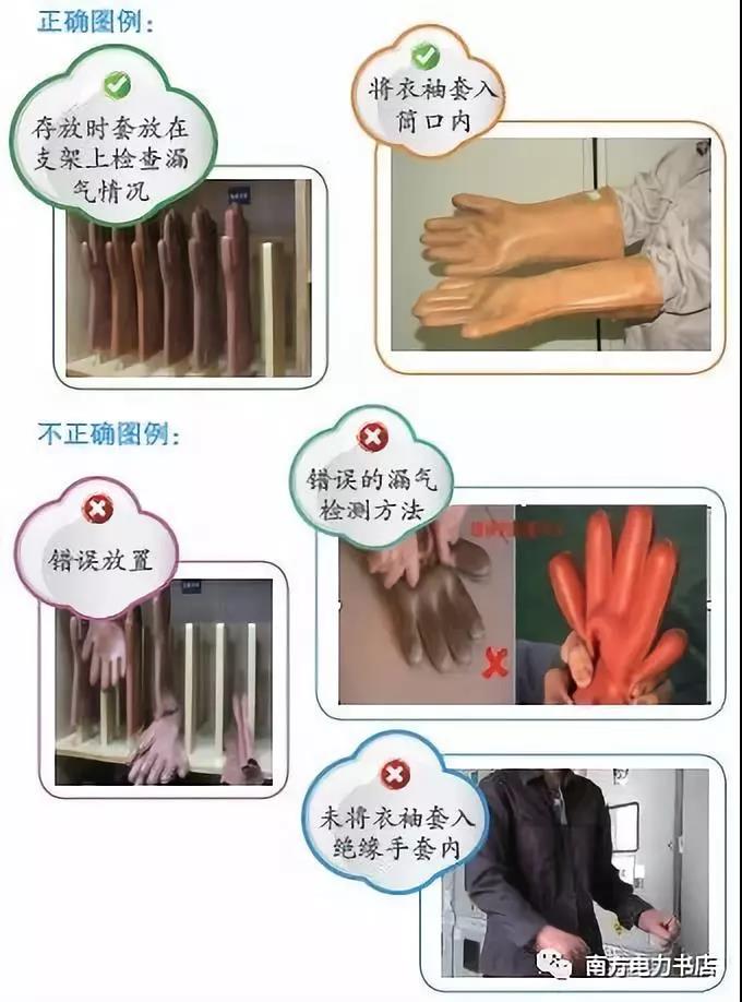 (1)絕緣手套佩戴在工作人員雙手上,且手指和手套指孔吻合牢固;不能戴絕緣手套抓拿表面尖利、帶電刺的物品,以免損傷絕緣手套。