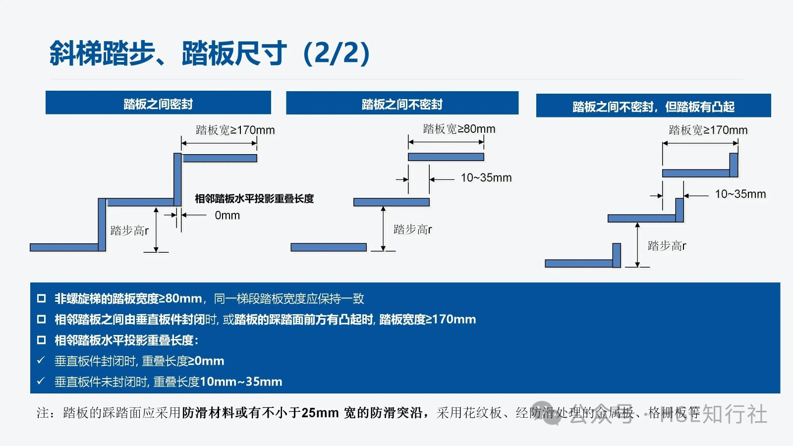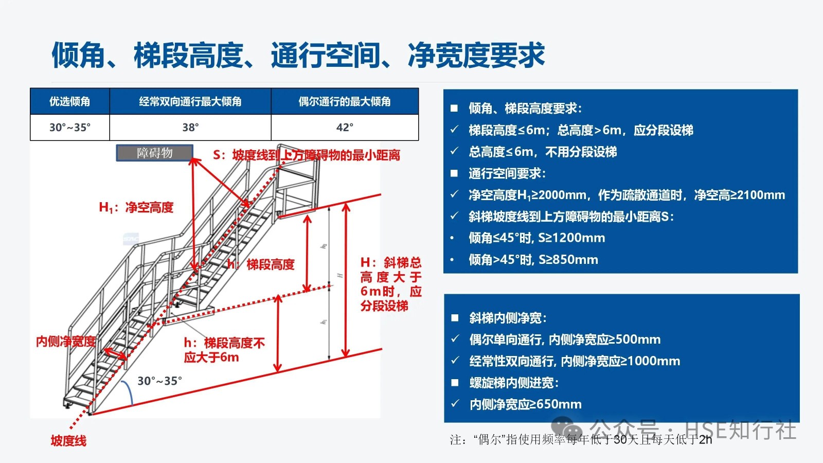 適用范圍 適用于工業(yè)企業(yè)內(nèi)工作場所中使用的固定式金屬斜梯的設(shè)計(jì)、制造和安裝。不適用于安裝在核設(shè)施、船舶、 起重機(jī)械、輸電塔上的固定式金屬斜梯。 傾角、梯段高度、通行空間、凈寬度要求 傾角、梯段高度要求: 梯段高度≤6m;總高度>6m,應(yīng)分段設(shè)梯。 總高度≤6m,不用分段設(shè)梯。 通行空間要求: 凈空高度:H1≥2000mm,作為疏散通道時(shí),凈空高≥2100mm 斜梯坡度線到上方障礙物的最小距離S: 傾角≤45°時(shí), S≥1200mm 傾角>45°時(shí), S≥850mm 斜梯內(nèi)側(cè)凈寬: 偶爾單向通行, 內(nèi)側(cè)凈寬應(yīng)≥500mm 經(jīng)常性雙向通行, 內(nèi)側(cè)凈寬應(yīng)≥1000mm 螺旋梯內(nèi)側(cè)進(jìn)寬: 內(nèi)側(cè)凈寬應(yīng)≥650mm 注:“偶爾”指使用頻率每年低于30天且每天低于2h。 傾角要求: 優(yōu)選傾角:30°~35° 經(jīng)常雙向通行最大傾角:38° 偶爾通行的最大傾角:42° 斜梯踏步、踏板尺寸 平臺(tái)設(shè)置要求: 1、斜梯的踏步寬與踏步高的組合值L計(jì)算: 550mm≦L=g+2r≦700mm g——踏步寬,單位為毫米(mm) r——踏步高,單位為毫米(mm) 2、常用的斜梯傾角與踏步寬、踏步高尺寸組合(L =600mm時(shí)): 傾角 30° 35° 40° 45° 50° 55° 60° 65° 70° 75° 踏步高(r) 160 175 185 200 210 225 235 245 255 265 踏步寬(g) 280 250 230 200 180 150 130 110 90 70 注:常用的斜梯傾角不低于30°,成人步距平均在600mm左右, 常用的L取值為600mm。 3、不同踏板形式的踏板寬度、相鄰踏板水平投影長度也不相同,具體如下: 踏板之間封閉: 踏板之間不封閉: 踏板之間不封閉,但踏板有凸起: 非螺旋梯的踏板寬度≥80mm,同一梯段踏板寬度應(yīng)保持一致。 相鄰踏板之間由垂直板件封閉時(shí), 或踏板的踩踏面前方有凸起時(shí), 踏板寬度≥170mm。 相鄰踏板水平投影重疊長度: 1、垂直板件封閉時(shí), 重疊長度≥0mm 2、垂直板件未封閉時(shí), 重疊長度10mm~35mm 注:踏板的踩踏面應(yīng)采用防滑材料或有不小于25mm 寬的防滑突沿,采用花紋板、經(jīng)防滑處理的金屬板、格柵板等。 螺旋梯踏步、踏板尺寸 距離螺旋梯扇形踏步窄邊300mm處的踏步寬應(yīng)不小于170mm。 螺旋梯的踏步高應(yīng)在160mm~240mm范圍內(nèi)。 螺旋梯同一梯段踏板的平面投影圓心角應(yīng)保持一致(梯段頂部踏板除外)。 防護(hù)欄桿與扶手 防護(hù)欄桿設(shè)置: 當(dāng)斜梯側(cè)面敞開邊緣的臨空高度≥1200mm時(shí), 敞開邊緣應(yīng)設(shè)置防護(hù)欄桿。 傾角≤45°的斜梯, 防護(hù)欄桿立柱應(yīng)垂直于踏板, 并從第一級(jí)踏板起始設(shè)置。 傾角>45°的斜梯: 1、防護(hù)欄桿立柱垂直于踏板時(shí), 立柱從第一級(jí)踏板起始設(shè)置。 2、防護(hù)欄桿立柱垂直于起坡線時(shí),起始位置設(shè)置要滿足以下要求: 下方工作面有防護(hù)欄時(shí),起點(diǎn)與防護(hù)欄頂部橫桿連接。 下方工作面無防護(hù)欄時(shí),起點(diǎn)距離工作面豎向距離≤1200mm。 立桿垂直于起坡線,下方有護(hù)欄 立桿垂直于起坡線,下方無護(hù)欄 扶手設(shè)置: 扶手設(shè)置主要根據(jù)斜梯的傾角、斜梯的梯寬來設(shè)置,設(shè)置要求如下圖: 斜梯防護(hù)欄桿高度≤1200mm時(shí), 頂部橫桿兼做扶手。 單獨(dú)設(shè)置斜梯扶手時(shí), 扶手豎直高度為860mm~1000mm。 扶手起始點(diǎn)距離地面或平臺(tái)的垂直距離應(yīng)≤1000mm。 梯間平臺(tái)與門 梯間平臺(tái): 1、梯間平臺(tái)寬度應(yīng)不小于梯子寬度, 對(duì)斜梯應(yīng)不小于760mm 。 2、梯間平臺(tái)在行進(jìn)方向上的長度應(yīng)不小于梯子寬度, 對(duì)斜梯應(yīng)不小于850mm。 3、梯間平臺(tái)要符合GB4053.3—2025的規(guī)定。 自閉門: 1、自行關(guān)閉、保持在關(guān)閉位置但不鎖定。 2、采用平開方式向平臺(tái)內(nèi)打開、打開角度不小于 90°。 3、關(guān)閉時(shí)由擋塊阻擋,防止人員推開發(fā)生墜落或其他意外傷害。 4、不設(shè)置踢腳板、底部距離平臺(tái)高度為120mm~500mm。 5、自閉門要符合GB4053.3—2025的規(guī)定。 荷載 梯梁、踏板、頂部橫桿、中間桿、立柱荷載如下: 1、梯寬<1200mm 時(shí), 非螺旋梯踏板應(yīng)承受跨中100mm×100mm 區(qū)域上作用≥1.5kN集中活荷載。 2、梯寬梯寬≥1200mm時(shí), 非螺旋梯踏板應(yīng)承受跨中間隔600mm的兩100mm×100mm區(qū)域上同時(shí)作用≥1.5kN集中活荷載。 3、螺旋梯的踏板應(yīng)承受靠近外側(cè)邊緣100 mm×100mm 區(qū)域上作用不小于1.5kN 集中活荷載。 使用說明和警示信息 斜梯的使用說明和警示信息,主要從“斜梯的使用說明”、“斜梯的警示信息”、“自閉門的警示信息”三方面來完善,同時(shí)涉及到的安全色和安全標(biāo)志應(yīng)符合 GB2894 的規(guī)定。 1、斜梯的使用說明,包括但不限以下內(nèi)容: a) 斜梯、平臺(tái)的最大允許荷載.。 b) 自閉門的安全使用信息。 c) 維護(hù)和檢查的要求。 需要設(shè)計(jì)、制造方提供使用說明。 2、斜梯的警示信息,包括但不限以下內(nèi)容: a)最大荷載信息(包括允許的最大負(fù)載人數(shù)、工具和裝備等最大附加荷載)。 b)人員攀登時(shí)的安全要求(例如當(dāng)心墜落、必須戴安全帽等)。 3、自閉門的警示信息,包括但不限以下內(nèi)容: a)禁止倚靠的信息。 b)小心墜落的信息。 c) 提示非通行狀態(tài)保持