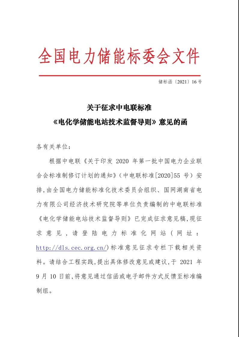 征求意見:關(guān)于征求中電聯(lián)標準《電化學儲能電站技術(shù)監(jiān)督導則》意見的函