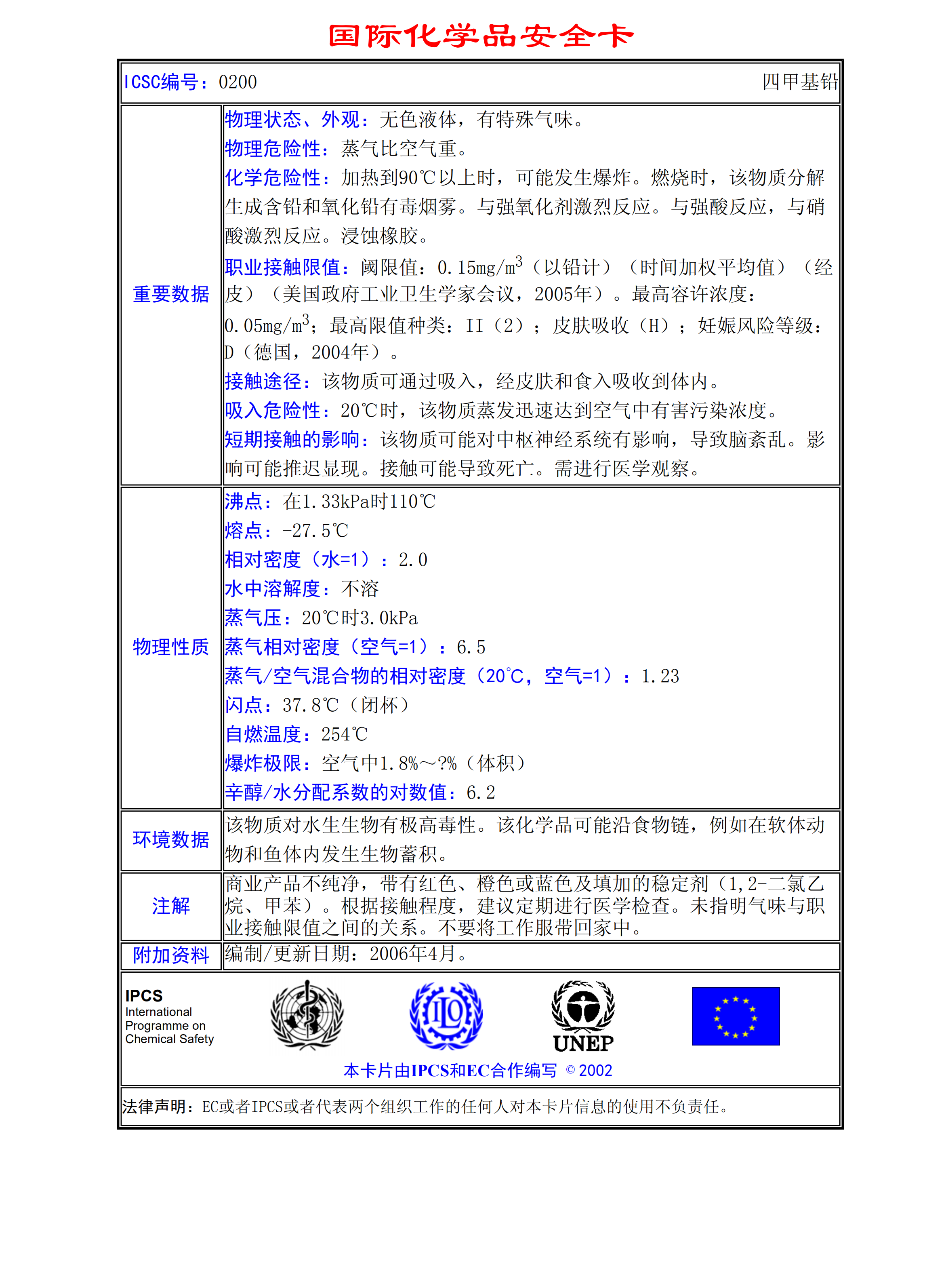 四甲基鉛MSDS