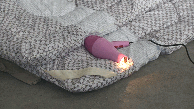 為了查證這個(gè)靠近起火點(diǎn)位置的斷頭線路究竟是哪種電器,火調(diào)員通過(guò)水洗篩選的辦法,在起火點(diǎn)附近的燃燒殘留物中發(fā)現(xiàn)了部分線路和一個(gè)金屬片,經(jīng)比對(duì),該金屬片是電吹風(fēng)上用于固定電阻絲的“云母片”。