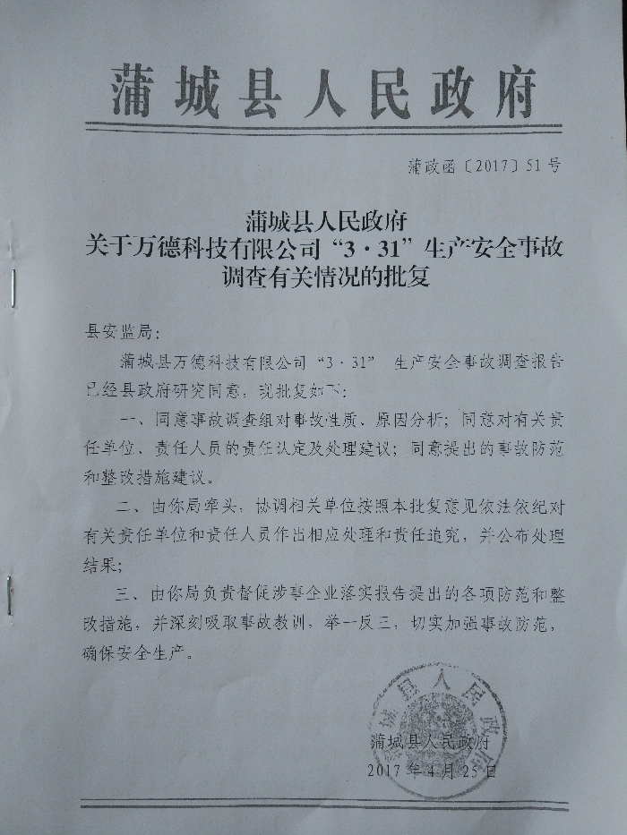 2、對(duì)本起事故主體責(zé)任單位蒲城萬(wàn)德科技有限公司,依據(jù)《安全生產(chǎn)法》第一百零九條第一款,建議處以五十萬(wàn)元的罰款。