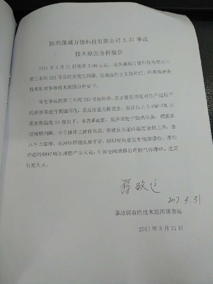 2017年3月31日凌晨3:00左右,蒲城萬(wàn)德科技有限公司第三車間223反應(yīng)釜發(fā)生閃爆,引發(fā)第三車間著火,造成一起1名夜班工人死亡。事故發(fā)生后,該公司值班領(lǐng)導(dǎo)向公司領(lǐng)導(dǎo)進(jìn)行了報(bào)告,該公司立即啟動(dòng)了《生產(chǎn)安全事故應(yīng)急救援預(yù)案》,組織工人啟動(dòng)消防水泵進(jìn)行現(xiàn)場(chǎng)救援,組織廠區(qū)其他工人撤出生產(chǎn)廠區(qū),同時(shí)向110、119、120請(qǐng)求救援,向相關(guān)政府部門進(jìn)行了報(bào)告。接到報(bào)告后,縣公安局陳莊派出所、安監(jiān)局、蒲城高新區(qū)管委會(huì)、消防大隊(duì)、120急救部門第一時(shí)間趕到現(xiàn)場(chǎng)進(jìn)行救援處置,凌晨4時(shí)20分左右成功撲滅事故現(xiàn)場(chǎng)明火。隨后該公司組織在第三車間二樓平臺(tái)找到王崗的尸體,證實(shí)該名工人在爆炸中當(dāng)場(chǎng)死亡。