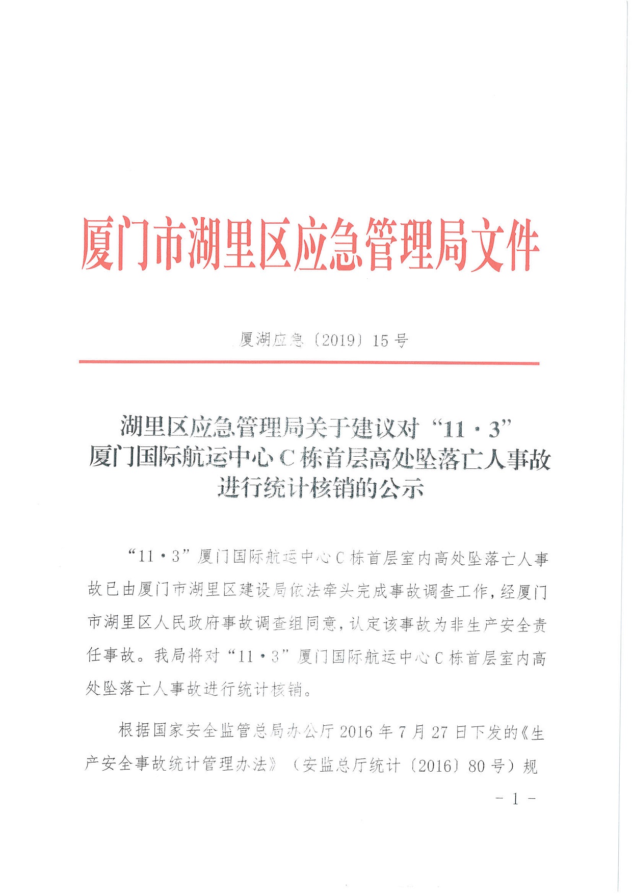 湖里區(qū)應急管理局關(guān)于建議對“11·3”廈門國際航運中心C棟首層高處墜落亡人事故進行統(tǒng)計核銷的公示