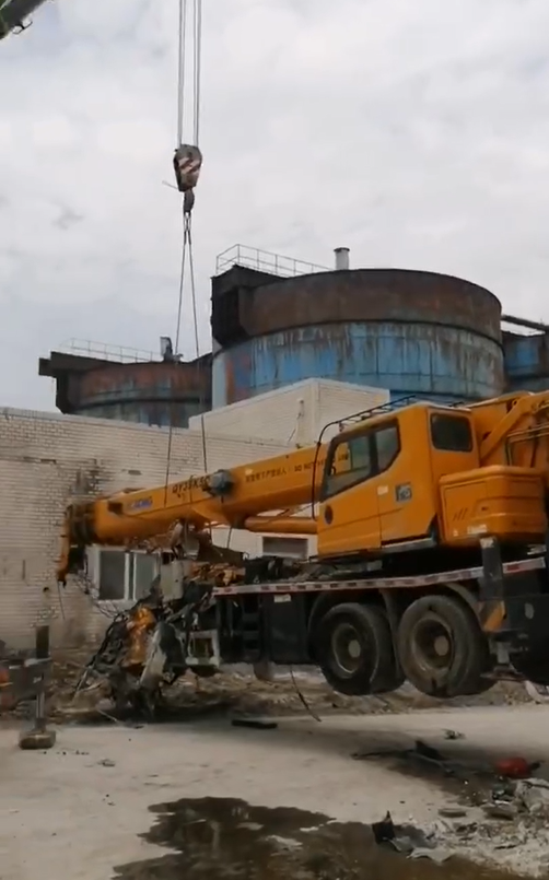 在某電廠內(nèi)容,一臺25k5吊車正在準(zhǔn)備開始吊裝工作,不料遭遇飛來橫禍,天降重物砸頂,車頭部分瞬間粉碎,幸好人沒有在車上...