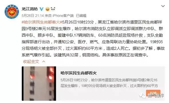據(jù)@龍江消防:#哈爾濱民生尚都著火#5月26日18時(shí)23分,黑龍江省哈爾濱市道里區(qū)民生尚都祥園9號(hào)樓2單元16層發(fā)生爆炸,哈爾濱市消防支隊(duì)立即調(diào)派立即調(diào)派群力中隊(duì)、群西中隊(duì)、顧?quán)l(xiāng)中隊(duì)、愛(ài)建中隊(duì)17輛消防車(chē)、68名消防員趕赴現(xiàn)場(chǎng)撲救,支隊(duì)全勤指揮部遂行出動(dòng),并通知公安、醫(yī)療、燃?xì)?、?yīng)急局聯(lián)動(dòng)力量協(xié)助處置。19時(shí)05分現(xiàn)場(chǎng)明火被全部撲滅,過(guò)火面積約60平方米,造成2人死亡。據(jù)初步了解,事故系燃?xì)獗ㄒ稹T摻ㄖ?2層,鋼混結(jié)構(gòu)。