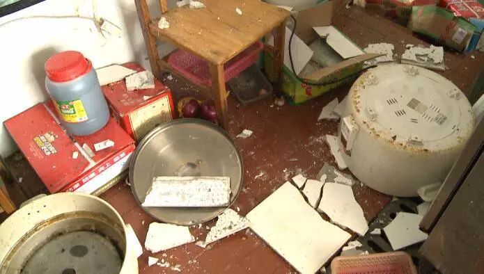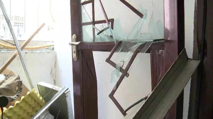 我婆婆就在這里開門出來,馬上就爆炸,飛到里面去了玻璃啊,我掃了這里啊,不然全部是玻璃,樓上的玻璃都爛下來了。