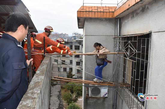中隊指揮員仔細勘察現(xiàn)場周圍情況后,發(fā)現(xiàn)被困的一家人的樓層與相鄰的樓層只隔了1、2米的距離,于是決定從對面樓層將被困人員營救出來。消防官兵找來單杠梯和木板搭在被困人家的窗口,然后再將備好的腰帶扔到對面,讓他們系好,腰帶則用繩索在另外一邊固定。為了讓他們穩(wěn)住重心,防止摔倒,消防官兵又找來另外一條木棍架在窗與圍墻之間,讓他們可以扶著過來。消防官兵一邊穩(wěn)住被困人員的情緒,一邊謹慎得操作著,將被困人員身上的保險緊緊拴牢,防止意外事故的發(fā)生。待被困人員快到圍墻邊,消防官兵則立即用手拉住他們,抱了上來。在經(jīng)過讓人窒息的20多分鐘后,一家5口終于有驚無險的被救了出來。