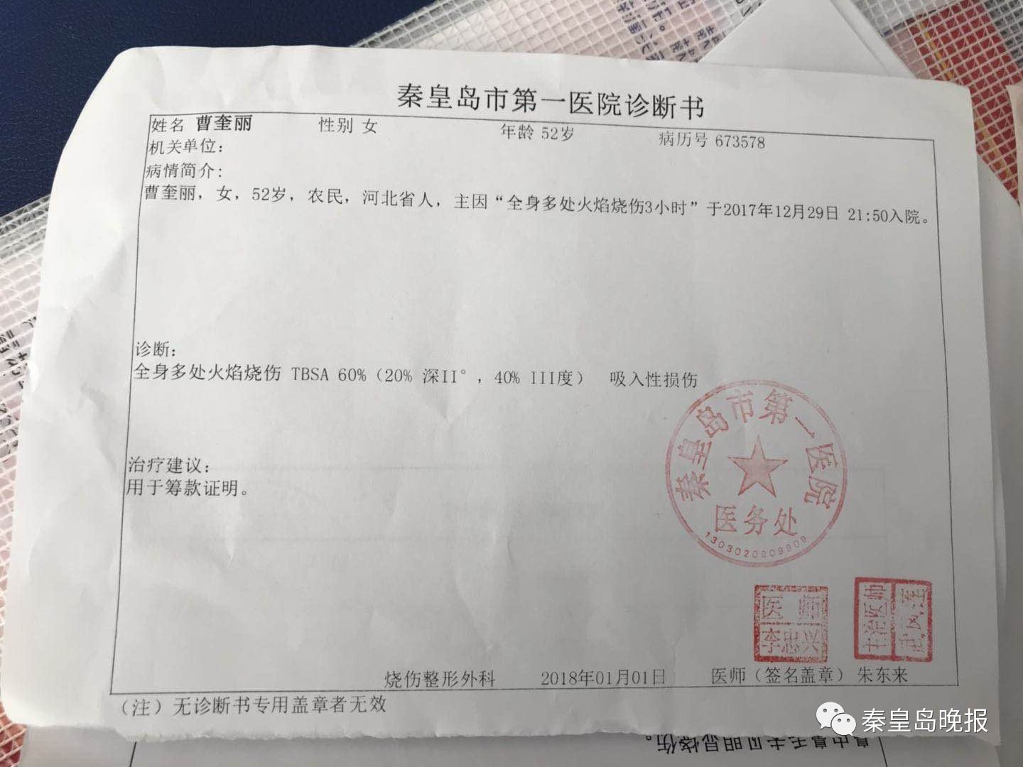 2017年12月29日,李偉鵬最不愿意回憶的一天——父母在青龍滿族自治縣龍王廟鄉(xiāng)經(jīng)營的小餐館煤氣罐泄漏爆炸引發(fā)火災(zāi),在火海中掙扎的父母被鄰居救出送往醫(yī)院,全身大面積燒傷,傷情更為嚴(yán)重的母親燒傷面積達60%。