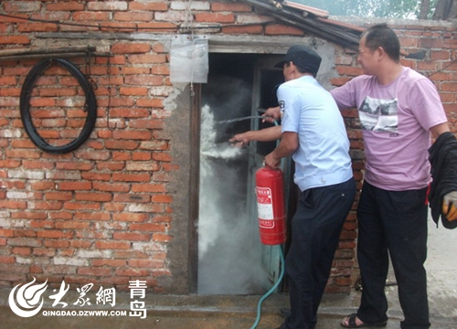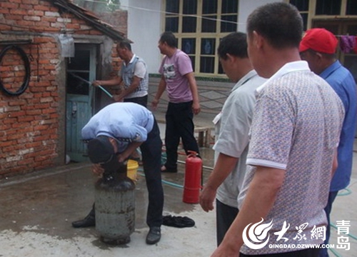 7月25日13時,黃島公安分局理務關派出所接到群眾報警,村民曲大娘在廚房給老伴煮綠豆湯時煤氣罐突然起火。接警后,理務關派出所民警立即趕到現(xiàn)場,發(fā)現(xiàn)煤氣罐在西屋廚房內(nèi),煤氣罐軟管接口脫落,接口處正在噴火,并且已經(jīng)引燃了附近的桌子,十分危險。民警迅速靠近火勢區(qū)域,頂著濃煙先將煤氣閥關閉,然后和附近群眾一起利用滅火器對廚房內(nèi)可燃物進行噴灑,并用打濕的衣物蓋在液化氣罐上對罐體進行冷卻,成功化解了險情。此時,曲大娘懸著的心也放了下來。