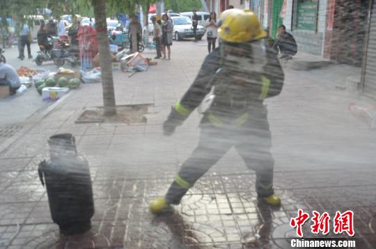 雖然水槍朝著液化氣罐持續(xù)射水,但已被燒成漆黑的罐體仍舊很燙。為了讓氣罐遠(yuǎn)離明火,劉愛文拎起氣罐將其轉(zhuǎn)移至室外安全地帶。在拎著氣罐向室外狂奔的過程中,水槍一刻未曾離開他和他手中的氣罐,最大限度確保其安全。